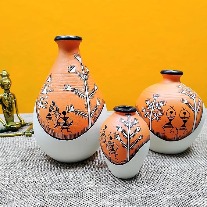 ARTYSTA BEAUTIFYING LIVES Earthenware’Warli Forests’Orange&Off White Handpainted Terracotta Oblong Flower Vases|Terracotta Decorative For Home Decor Earthen Flower Vase Pots For Home&Office(Set Of 3)